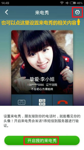 2、在来电秀界面中你可以直接点击下方的【开启我的来电秀】或者点击右上角的【设置】按钮,设置来电秀的相关内容。