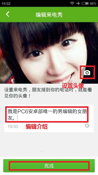 3、点击【开启我的来电秀】之后,你需要点击相机按钮通过拍照或者选择相册图片来设置自己的头像,然后编辑你的个性介绍。编辑完毕,就可以点击下方的【完成】了。