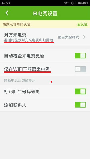 4、而点击【设置】按钮的话,你可以设置来电秀的相关内容,比方说对方来电秀的显示样式或者仅在WiFi下获取来电秀等等。