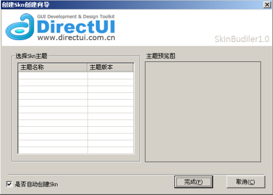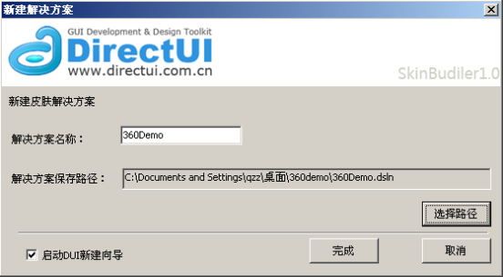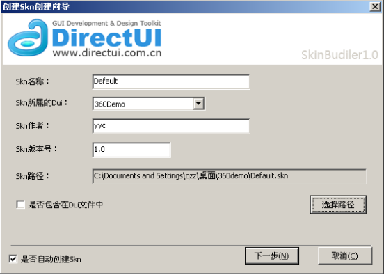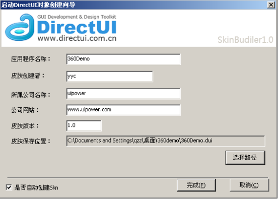 2)完成后将可以看到 DUI 文件的创建窗口,分别填写皮肤信息和 DUI 文件保存路径。