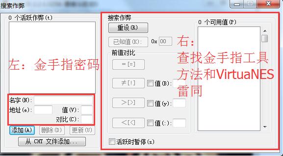 右边:查找金手指密码的工具,方法和VirtuaNES模拟器的方法类同,之前发过这里就不介绍了