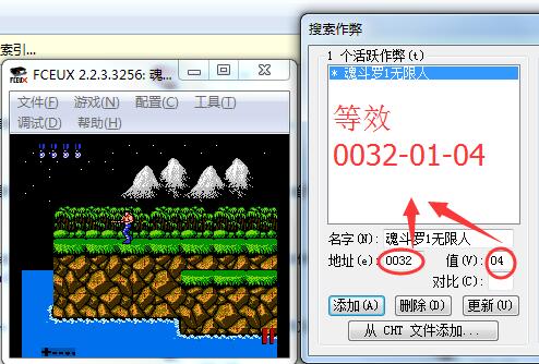 1.4.1 魂斗罗无限人金手指密码0032-01-04,在地址处填0032,在值处填04,然后点添加,测试可达到无限人效果
