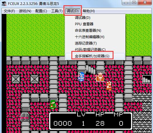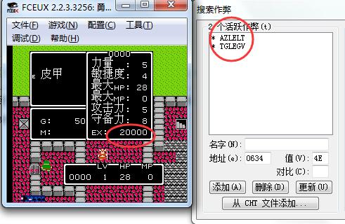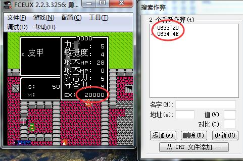 测试一:勇者斗恶龙2(中文5)为例,我们想金钱变成2万块,相应的金手指密码为0633-02-4E20。