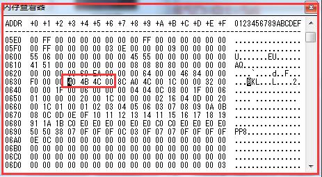当输入以上金手指密码时,0633内存地址的数值变成了40,0634内存地址的数值变成了4B,0635内存地址的数值变成了4C,0636内存地址的数值变成了00。