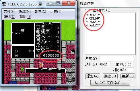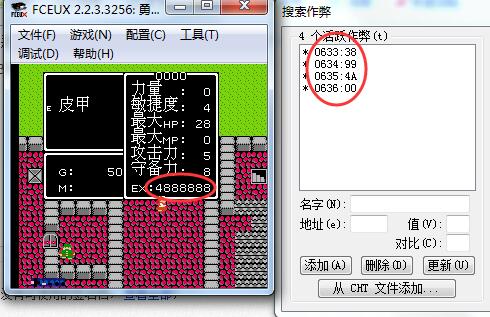 测试二:勇者斗恶龙2(中文5)为例,我们想经验变成488万8888,相应的金手指密码为0633-04-004A9938。