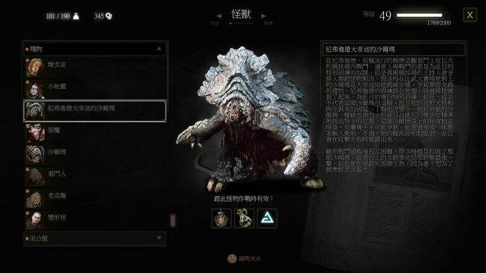 猎魔人世界中有无数的怪物, 每种怪物的能力和弱点不尽相同. 阅读怪物图鉴可以了解怪物信息让你更有效的与怪物作战. 例如妖灵类的怪物在灵体状态下防御非常高, 你需要用月之尘炸弹或者使用亚登法印令其实体化之后再进行攻击. 另外, 你如果想要更为合理的使用剑刃涂油, 就需先在怪物图鉴中了解怪物的种类.