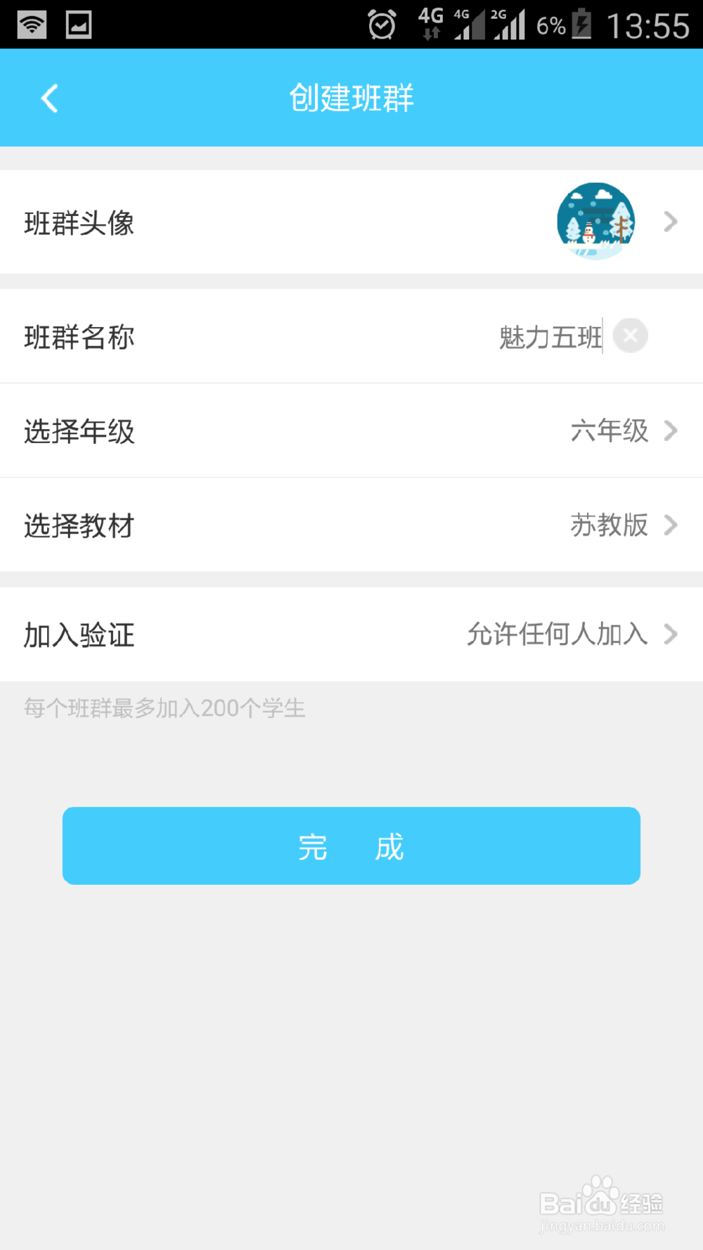 选择一个班群图像,输入班级名称,并且选择年级、教材和加入验证的方式。如图所示: