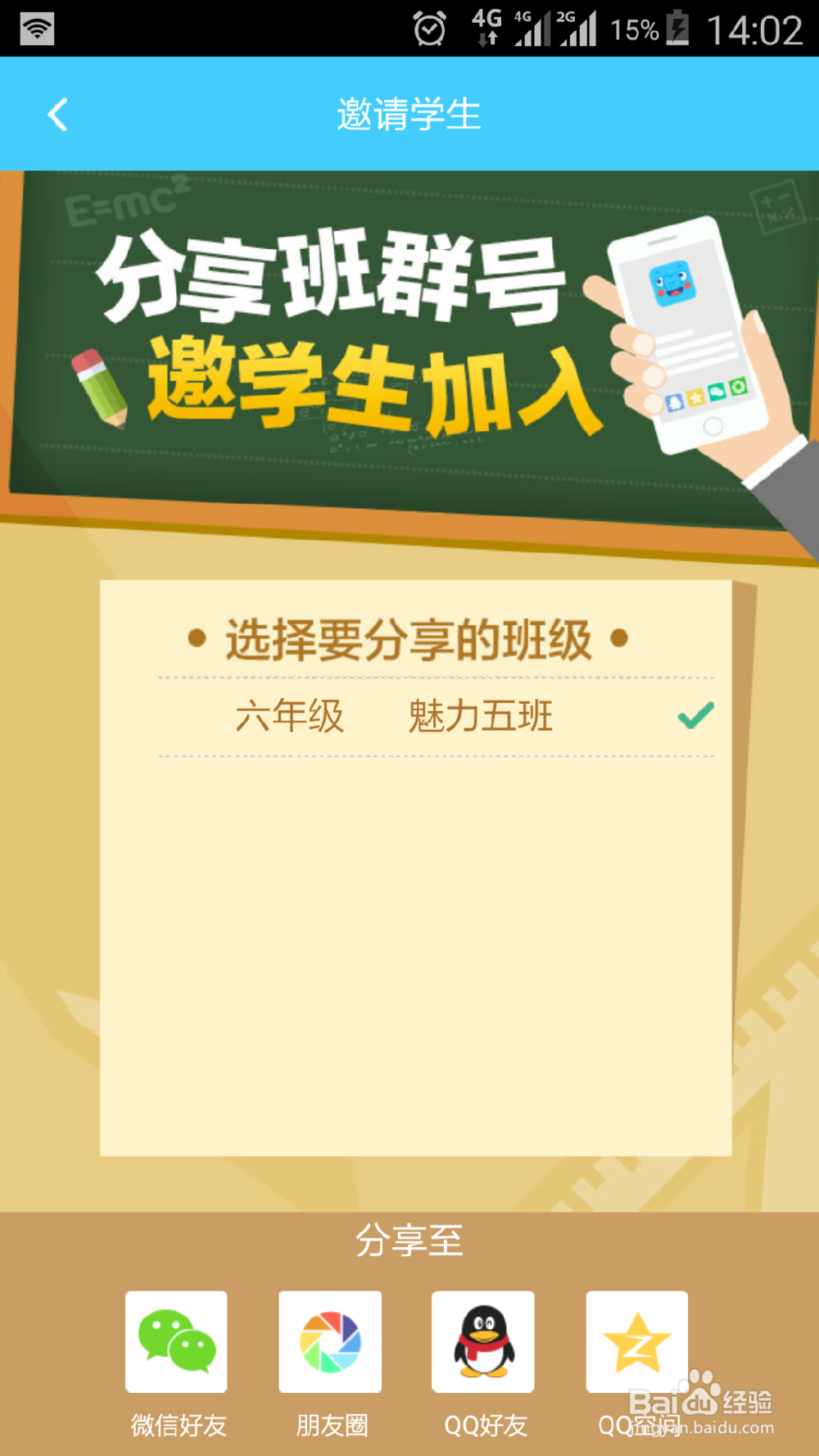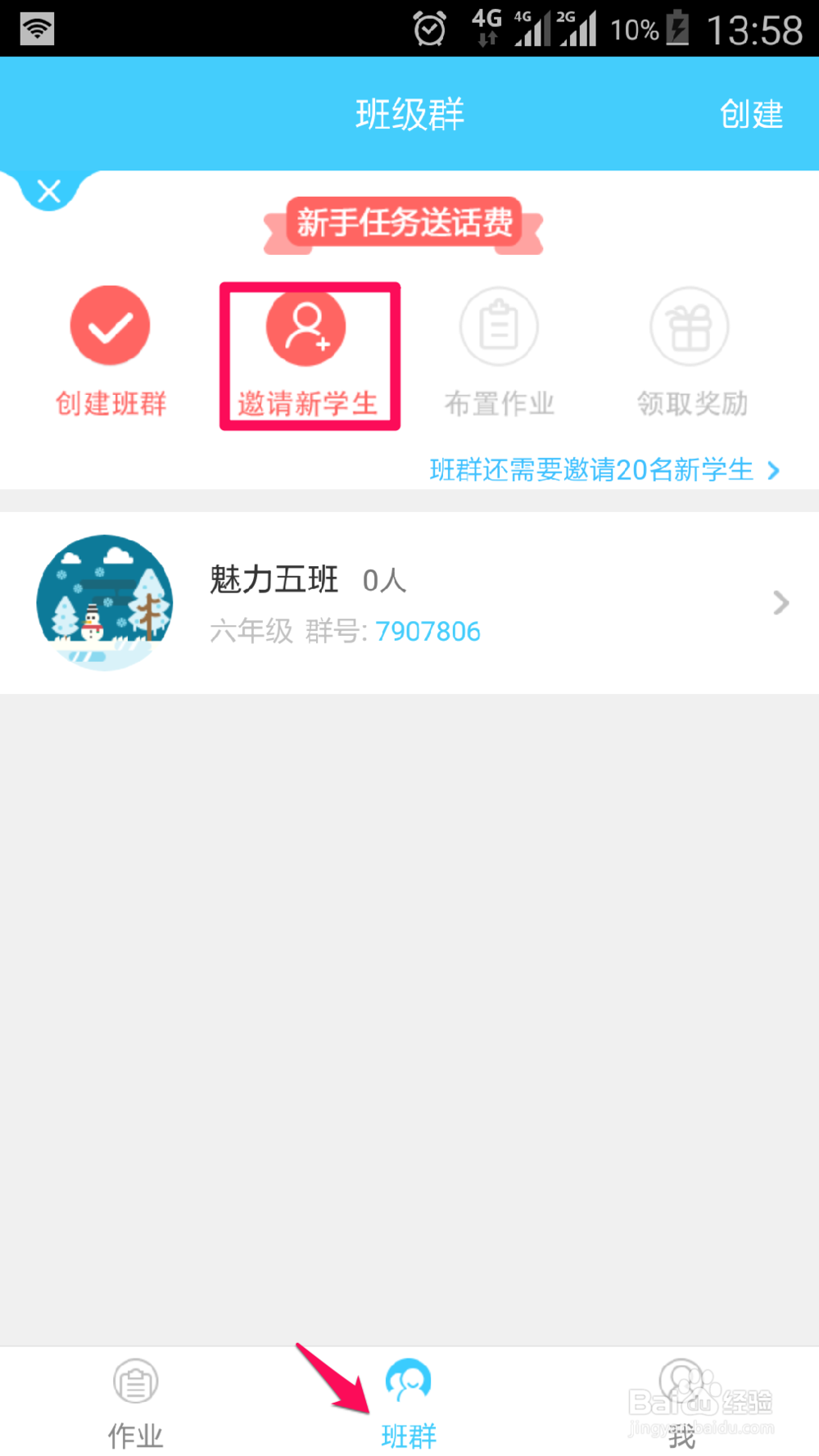 切换到“班群”选项卡,就可以看到所创建的群组,点击“邀请新学生”就可以邀请成员加入了。