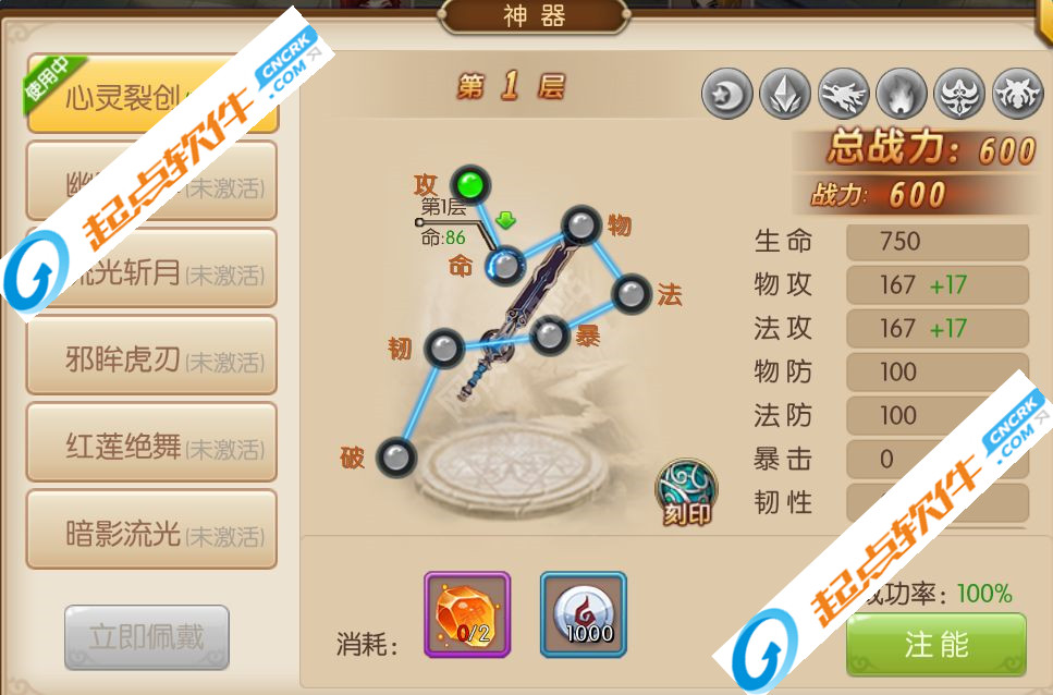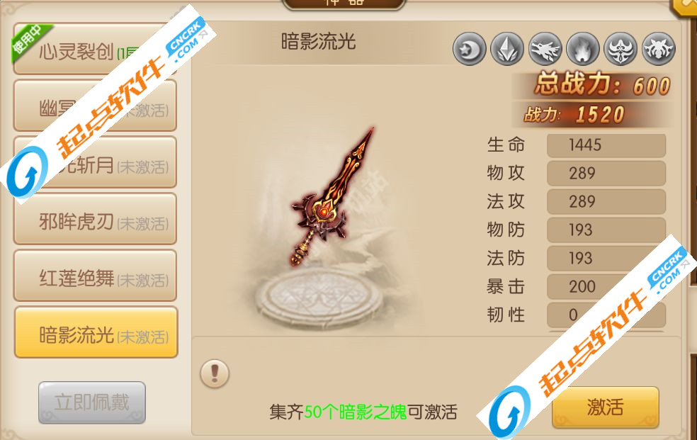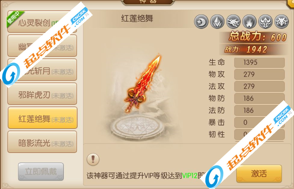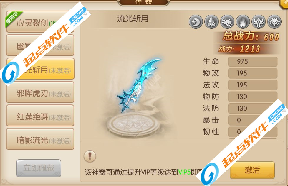 3.流光斩月:该神器可以通过提升VIP等级达到VIP5即可获得。