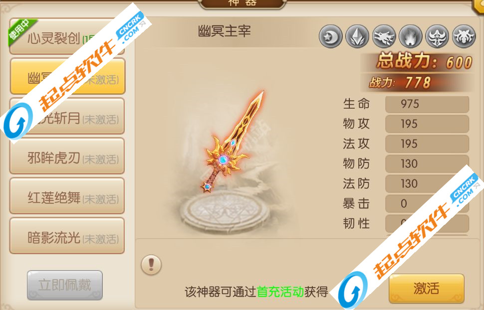 2.幽冥主宰:该神器可以通过首充活动获得。