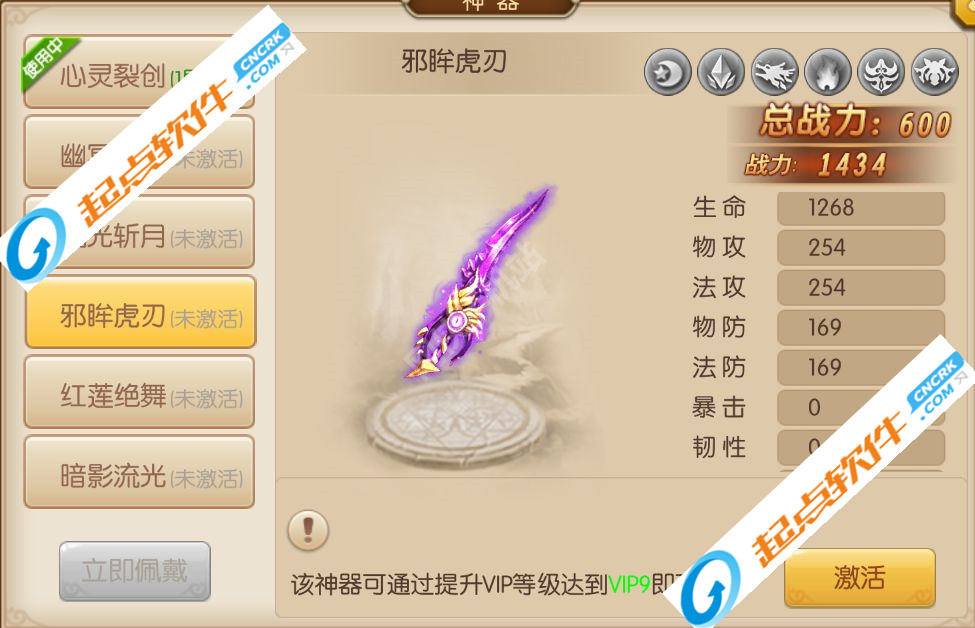 4.邪眸虎刃:该神器可通过提升VIP等级达到VIP9即可获得。