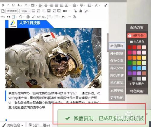 只需把内容编辑好后,直接点击右侧的【复制内容】按钮,然后粘贴到微信平台即可。