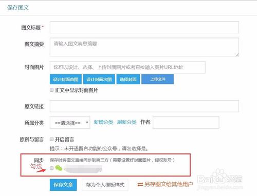 2、授权成功后,在“保存文章”的时候就可以勾选同步的公众号了,这样文章就会同时保存在微信公众平台的“素材管理”中了