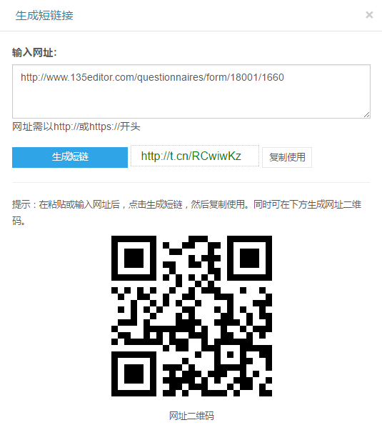 3、任何合法的网址,均可使用该工具对网址进行缩短和生成一个二维码。以上一个表单为例!