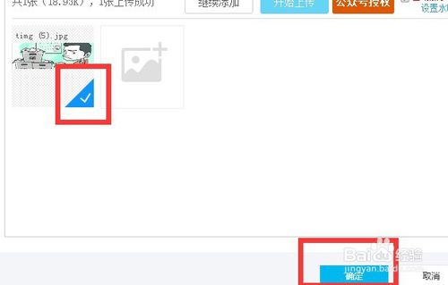 5、看到图片右下角有个蓝色的对勾就是上传成功,点击确定。