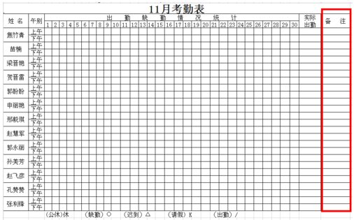6、别忘记了最后一栏放一个备注,主要备注每个新员工,或者因为非公请假等事项的一个处理。