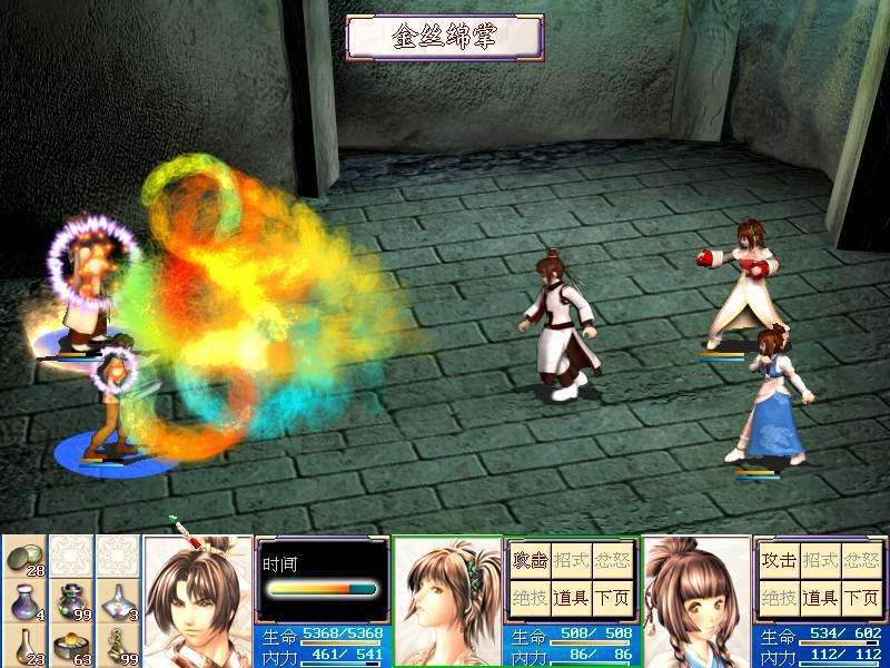 说明:如果你想升级快点的话,不用总是去打白虎,因为如果用绝技打白虎,你就没有可能拿到白虎像,只有用唯一的攻击方式一直打下去,就可以得到。如果一次不行,你可以存盘后继续打,直到打到为止。升级最快的是去山洞用绝技打人参,一加就加265,这样升级才会更快些。