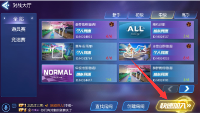 在我们进入赛道选择界面之后,我们可以自己建房,或者选择好友的房间,或者快速进入游戏赛道,当然我们要选择竞速模式;不过练习技术的话最好选择和人对战,和大家一起来玩,有竞争进步比较快些;
