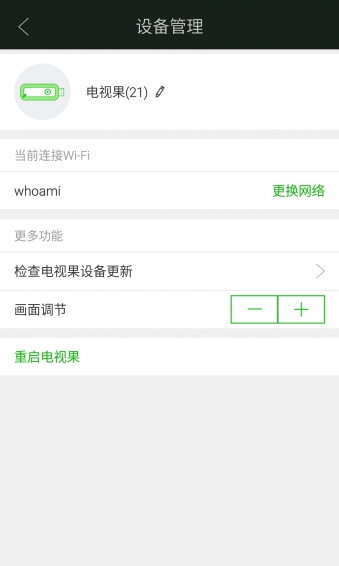 电视果是一款可在电视上使用的智能硬件,最主要的功能就是让您能轻松地将互联网上的视频内容推送到电视上观看。您可以在电视上播放我们的独家合作方——爱奇艺上的所有视频内容。您可以不再做低头族,看视频都可以到大屏上观看,相当于您拥有了60寸的手机频幕,保护您的颈椎。另外,视频选集、快进快退、调节音量等所有操作都只需要在手机上就能完成,轻松易用。