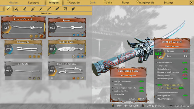用一百种方法杀死恶魔之后,我们的收获必须是非常丰富的。在高难度下,杀死强大的敌人除了能够获得强大的新武器之外,最重要的便是能够获得形形色色的宝石来强化武器,这也是武器系统的另外一个核心:宝石镶嵌强化系统。一般来讲,每件武器都有三个宝石槽,插上符合武器特点的宝石之后,能够有效地提高武器的特性,让战斗更加高效。后期开放的宝石合成系统能够把多余的宝石合成升级,游戏中个别暗金宝石更是有着逆天特效(是不是很有网游的既视感!),有的甚至能够让近战伤害提高30%,高难度下一把武士刀通关绝对不是梦!