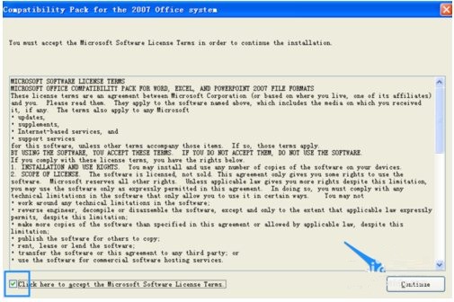 2、兼容包安装文件名为 FileFormatConverters.exe,大小37M。下载完成以后,打开安装包,勾选软件使用条款并点击 Continue 按钮,如图所示
