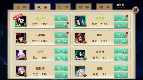 攻击类神将,顾名思义就是在战斗过程中负责主要输出的神将种类,代表人物有赵公明、伯邑考、马招娣等。攻击类神将整体生命值处于中等状态,攻击力较高,物理防御和法术防御根据自身属性而有所不同。其中攻击类神将又分为物理攻击和法术攻击,两种类型的神将分别应对不同属性的BOSS。玩家在游戏当中,应当根据神将的攻击类型进行选择上阵。根据攻击类神将攻击力高、防御力中等、生命力中等的特点,在阵容搭配上可以根据需要选择放在前排或后排。