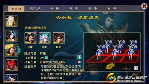 技能效果:与姬发和伏羲合击,攻击全体同时增加轩辕20%格挡,持续两2回合(提升怒气技能会提升该技能的附加伤害)