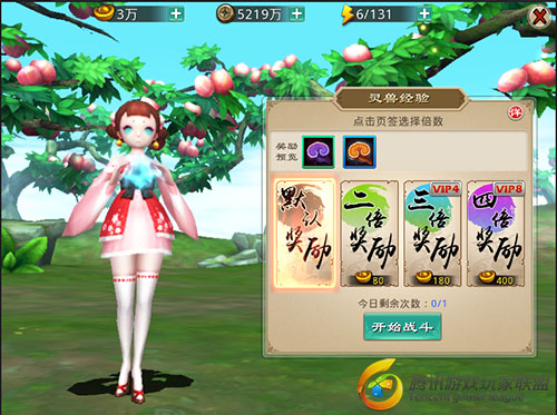 在日常中进入灵芝园,获取百年灵芝和千年灵芝。其中获取奖励分四个档次,默认奖励、二倍奖励、三倍奖励(vip4可选)、四倍奖励(vip8可选),阵容选择用法术群攻神将。