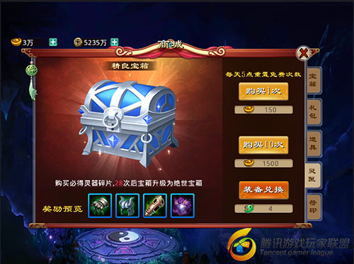 在商城里灵匣获得装备,每天5点重置免费获得一次购买,也可以用获得的灵器碎片兑换。(每购买一次获得一个灵器碎片)