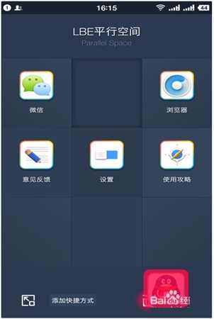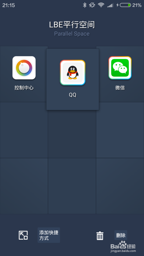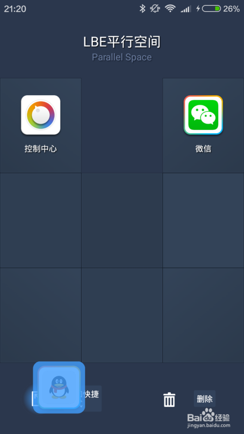 6、同样,你也可以将最常用的qq、微信等双开,来支持你不同的社交等等。双开应用的删除与安卓系统一样,长按你要删除的应用图标,下方会出现创建快捷方式和删除的字样,把图标放到删除附近就可以删除这个应用了。如果还要在双开回来再像前面的步骤添加就可以了