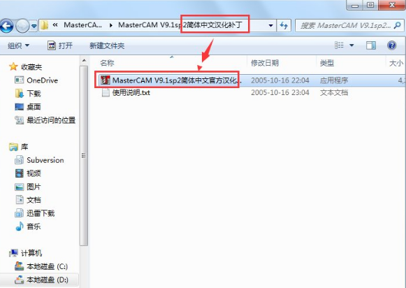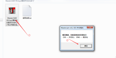 2、首先回到我们解压的 MasterCAM 9.1 目录下 --> 双击"MasterCAM V9.1sp2简体中文汉化补丁"