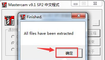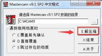 3、双击 "MasterCAM V9.1sp2简体中文官方汉化补丁(可以中英文互换).EXE" --> 点击 "E 解压缩" --> 点击 "确定"