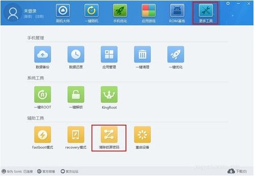 3、当手机驱动程序安装完成后,切换至主界面中的“更多工具”选择卡,接着点击“清除锁屏密码”按钮。