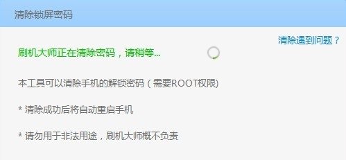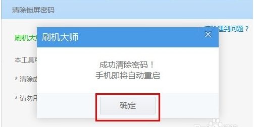 6、当手机Root权限被获取后,再次运行“清除锁屏密码”按钮,将会发现锁屏密码被清除掉啦,此时弹出窗口,提示手机将重启。