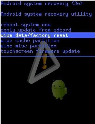 8、在Recovery模式下,利用“音量+”和“音量-”将光标移动到“wipe data/factory reset”项,并按一下“电源键”进行确认。