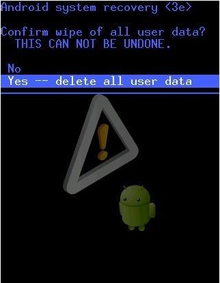 9、在随后打开的“确认清除用户数据”界面中利用“音量+”和“音量-”将光标移动到“Yes,delete all user data”项,按一下“电源键”进行确认。