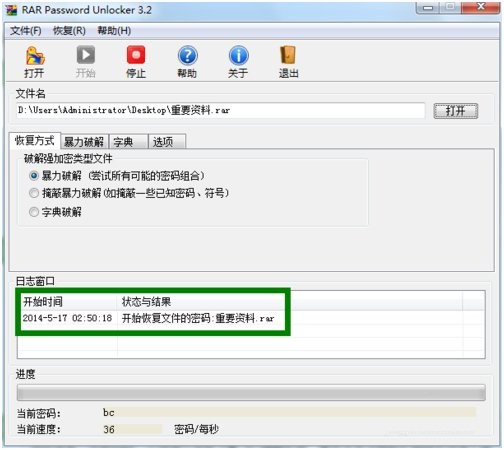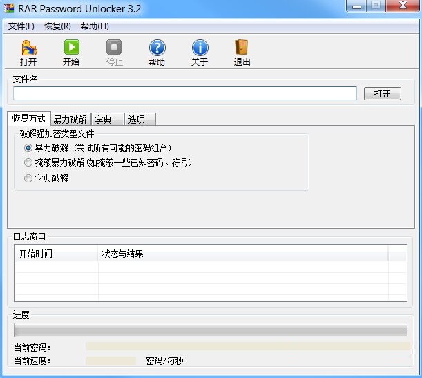 3、接下来点击“打开”按钮选择要破解的WinRAR文件。然后选择其中一种破解类型,当我们对密码信息一无所知时,小编建议选择“暴-力-破解”项,最后点击“开始”按钮正式进入破解过程。