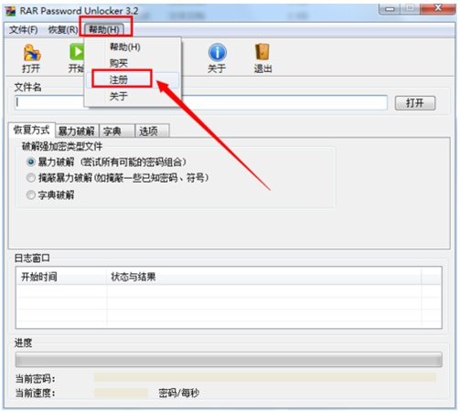 2、解压并运行其中的可执行程序,点击“帮助”->“注册”项,然后输入任意内容完成注册操作。