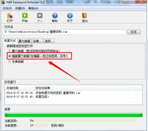 4、当然,如果要破解的压缩文件是自己之前所设置的密码,那么我们可以利用“掩蔽暴力破解”方式进行破解,从而大大减少破解所需要的时间。勾选“掩蔽暴力破解”项。