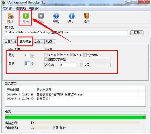 5、切换至“暴-力-破解”选项卡,然后根据自己的记忆来设置要破解的密码组合,最后点击“开始”按钮。