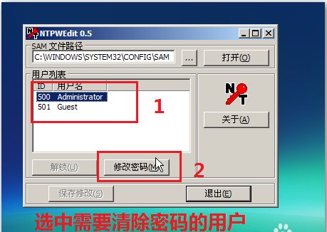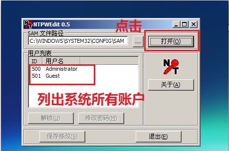 步骤二:打开破解登陆密码软件NTPWEdit后,点击【打开】,软件自动列出WIN7系统中的所有用户。