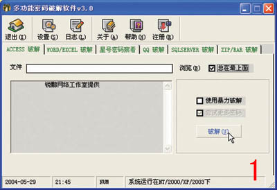 多功能密码破解软件可以破解Access97/2000/xp密码,Word/Excel97/2000/xp、SQLSERVER(本地和远程)、windows98登陆密码、ZIP/RAR文件密码,星号密码察看,可以察看任何显示为*的密码内容!