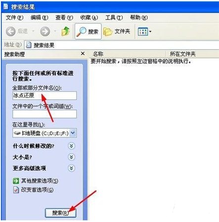 6、如果不知道安装包在哪,可以点击电脑的开始菜单,选择搜索,在全部或部分文件名输入冰点还原,进行搜索文件。