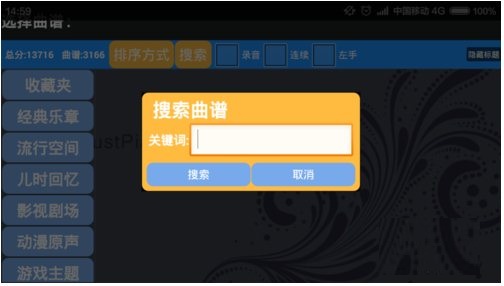 在练习模式中,每一个音符只有当你弹奏了以后才会掉落,然后才会进行下一个音符,非常适合新手朋友们使用,这里我们点击“搜索”按钮,搜索自己想弹的歌曲。