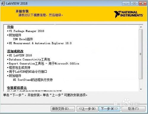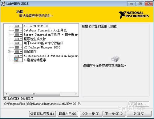 7.选择安装的组件(NI LabVIEW2018,Database Connectivity Toolkit-工具包,Report Generation 工具包,软件包生成支持,用于labview的NI命令行接口,VI Package Manger 2018,附加组件,NIMeasurement&Automation Explorer ,NI设备驱动程序),点击下一步。