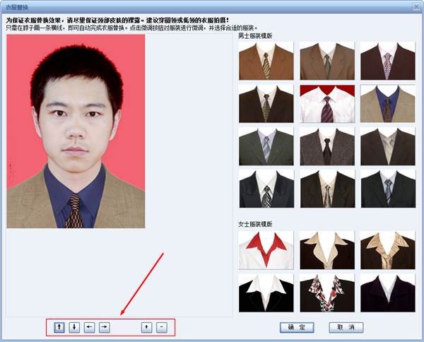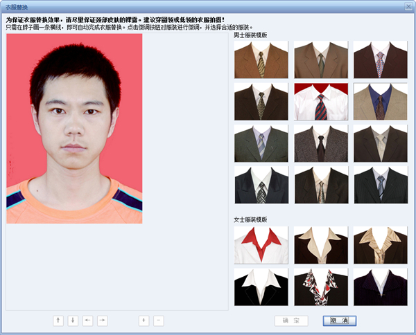 4、这里有很多证件照用模板供大家选择,而且还进行了男士和女士分类,以便于使用者进行选择。我们根据需要选择其中一套衣服,然后按照软件提示,在证件照脖子处画一条横线,这样就可以完成替换工作啦!