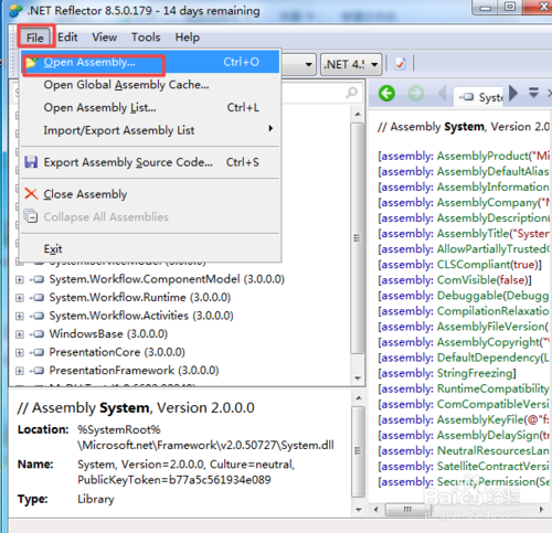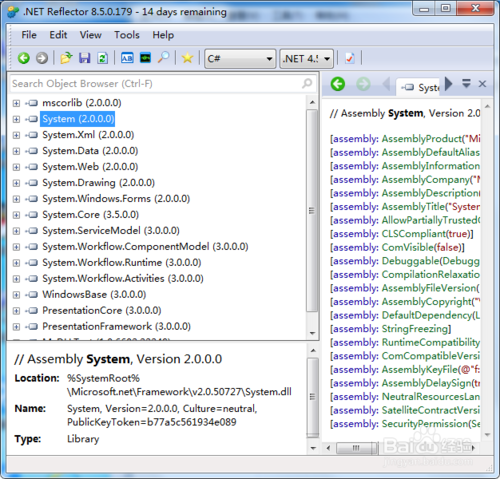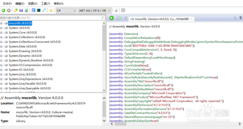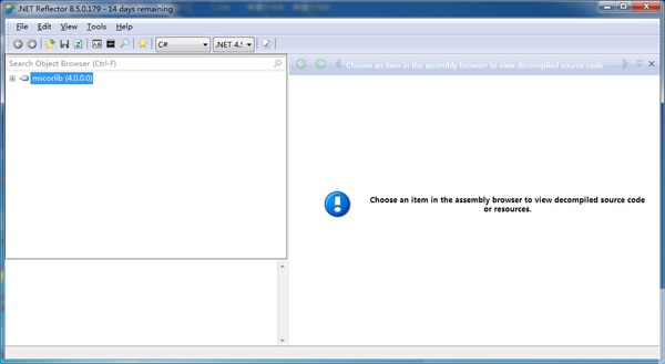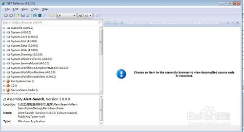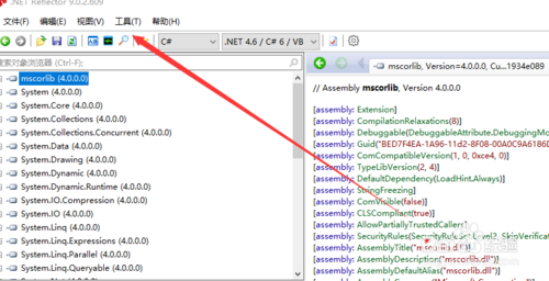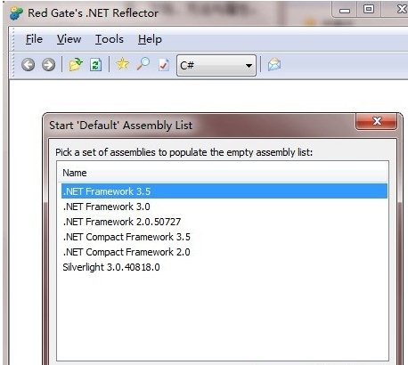下载Reflector,解压后,双击Reflector.exe,如果有选择默认版本的.Net Framework,根据需要选择即可。你选择的版本不同则出现的默认程序集也不同。