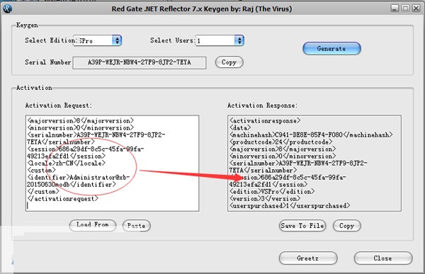 6.拷贝 Reflector 左侧的一大堆请求字符串,粘贴到注册机左侧框框,会自动计算注册码
