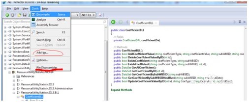 运行Reflector,点击Tools—add-ins,选择Reflector.FileDisassembler.dll (下载Release文件夹中FileDisassembler解压后的文件中有)添加成功后,Close关闭对话框。在Tools菜单中会有file disassembler选项。