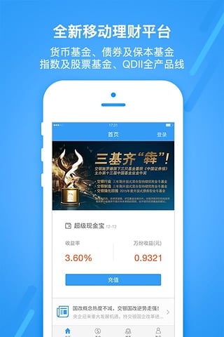 兼具现金管理、净值查询、基金交易、优选推荐、定制盈亏、精彩活动多项强大功能,满足您全方位理财需求。